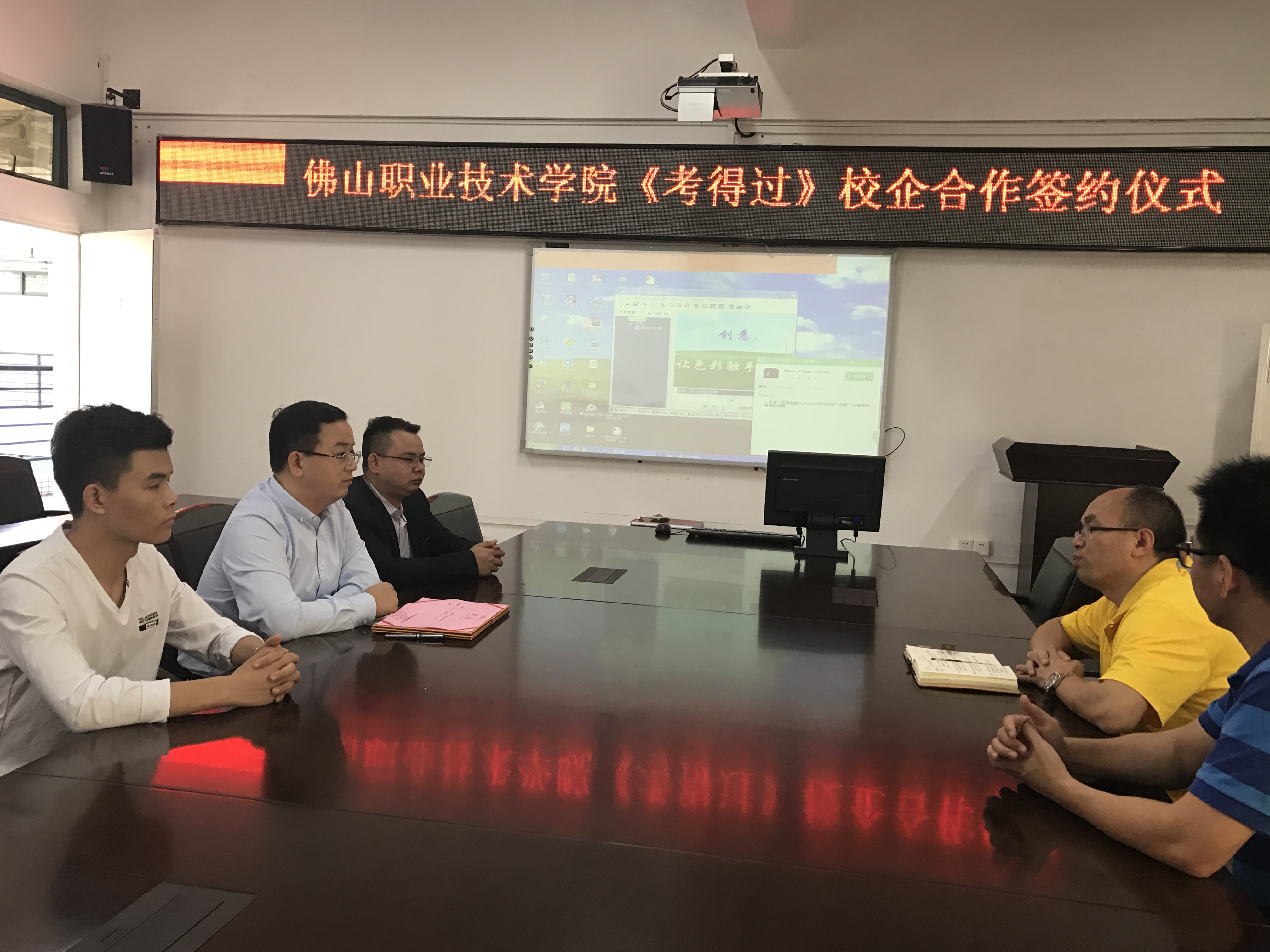 议上,佛职院汽车系主任龙志军博士详细地介绍了学院的概况、教学理念以及近年来学院代表在全国各类大赛中所获得的奖项;表达了对考得过APP进入佛职院的热烈欢迎;也提及到现在高职院校的教学模式,应该结合移动互联网的发展。广州铭智董事长谢兆林表示对这次合作是非常有信心的;也为佛职院的领导、老师们介绍了考得过的功能、特点;考得过能有效地帮助老师了解学生的学习情况,加强管理,从而提高学生的考试通过率。